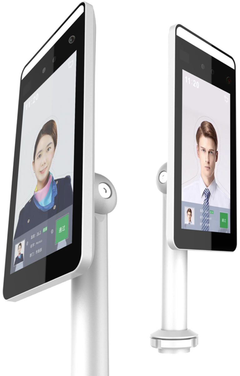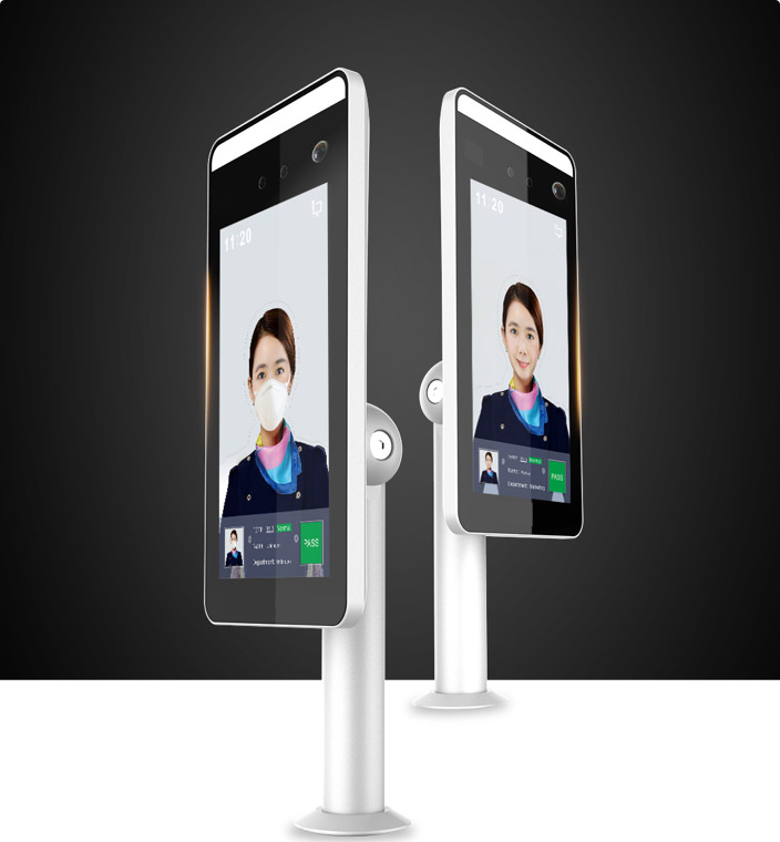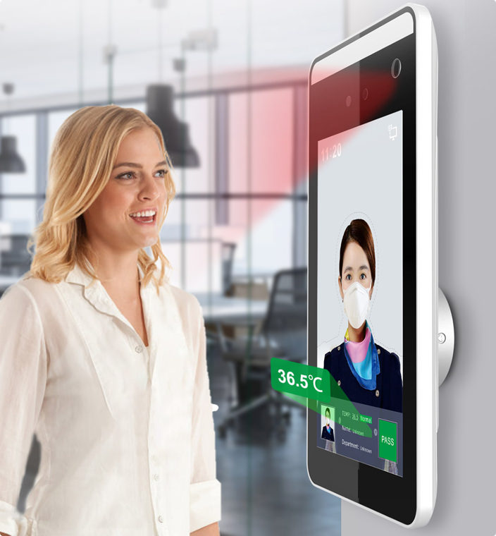 - Borne de détection de température corporelle pour visiteurs d’ERP. Possibilité d’activer le mode détection du port de masque.